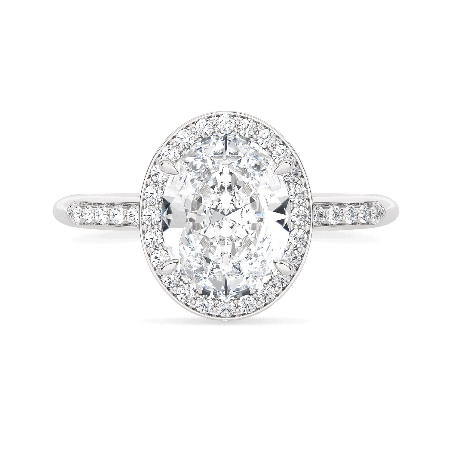Anello in Oro Bianco 750/°°° (18 Kt) con Diamante Lab Grown Ovale di Ct. 1,51 (VS2 F) e contorno di diamanti Lab Grown taglio brillante per una caratura complessiva di Ct. 1,81.