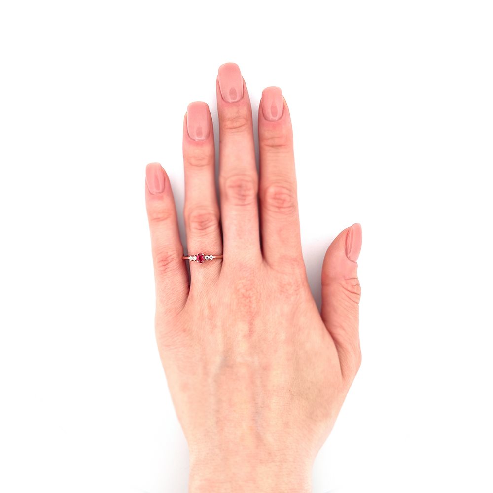Anello in oro rosa 18 KT con rubino naturale di taglio ovale misura 4X3 mm e 4 diamanti bianchi qualità G Si da 0.02 ct per una caratura totale di 0.08 ct