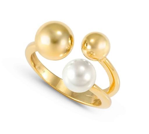 Anello Fashion Era con 2 Sfere in Argento 925 e 1 Perla di Conchiglia. Realizzato con rivestimento superficiale in rodio bianco o oro giallo 750. Le perle di conchiglia si ottengono dal rivestimento interno delle conchiglie delle ostriche, noto anche come madreperla. La sostanza viene lavorata e rivestita di madreperla naturale e poi di un rivestimento protettivo per conferire lucentezza.