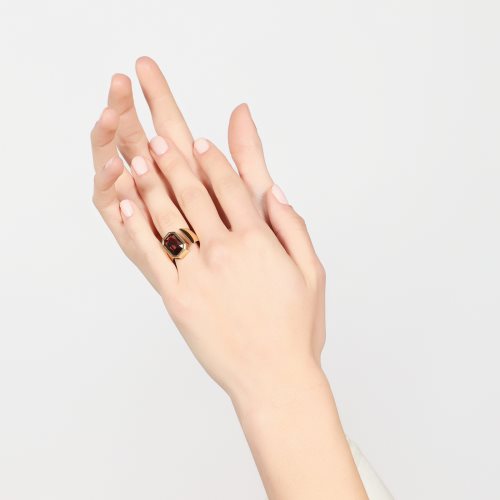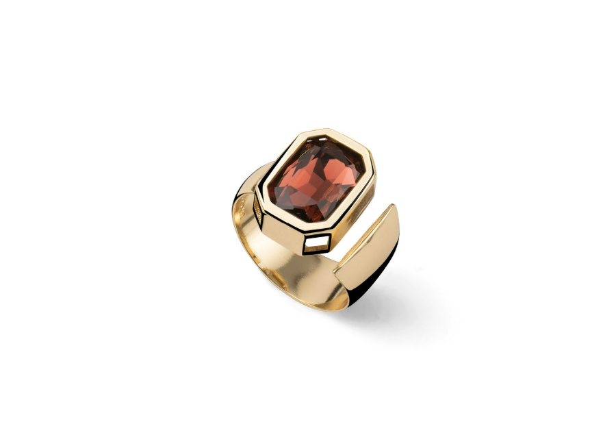 Anello con cristallo marrone taglio smeraldo placcato oro. Collezione Joya.