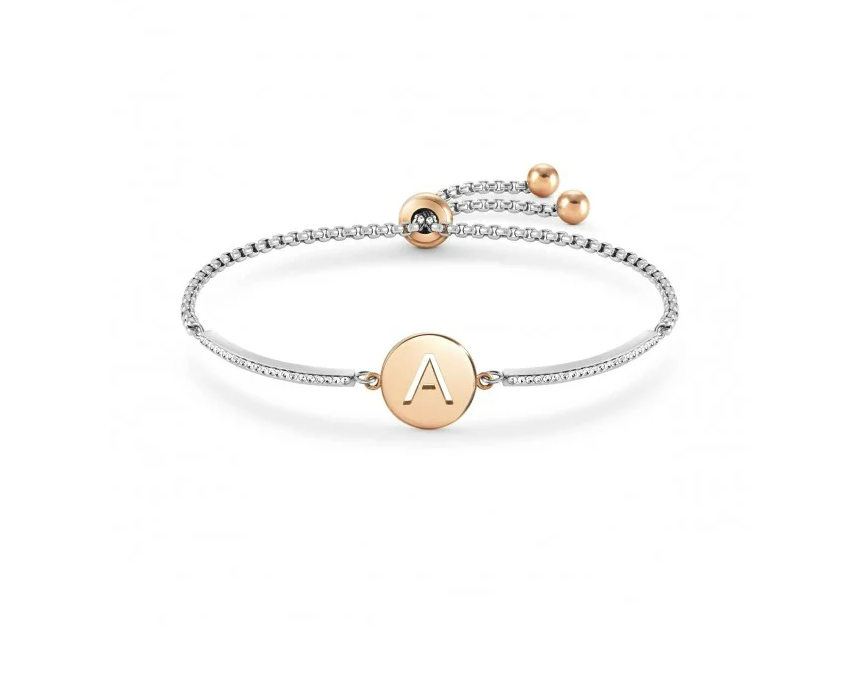 Bracciale con pendente con Lettera A in Acciaio 316/304 anallergico, dettagli in PVD rosa e pavé di Cristalli bianchi. Lunghezza 19 cm, adattabile a 14 cm. Misura del pendente 1,2 x1,2 cm.