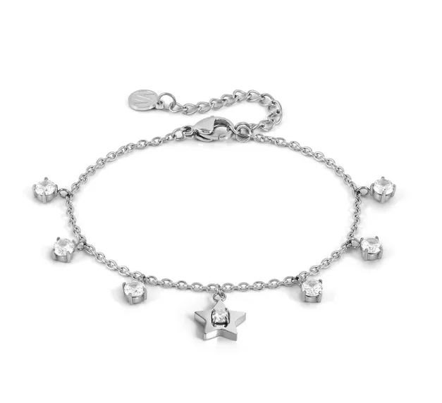 Il gioiello รจ realizzato in acciaio inossidabile con ciondolini a forma di fiore e punto luce con zirconi bianchi.