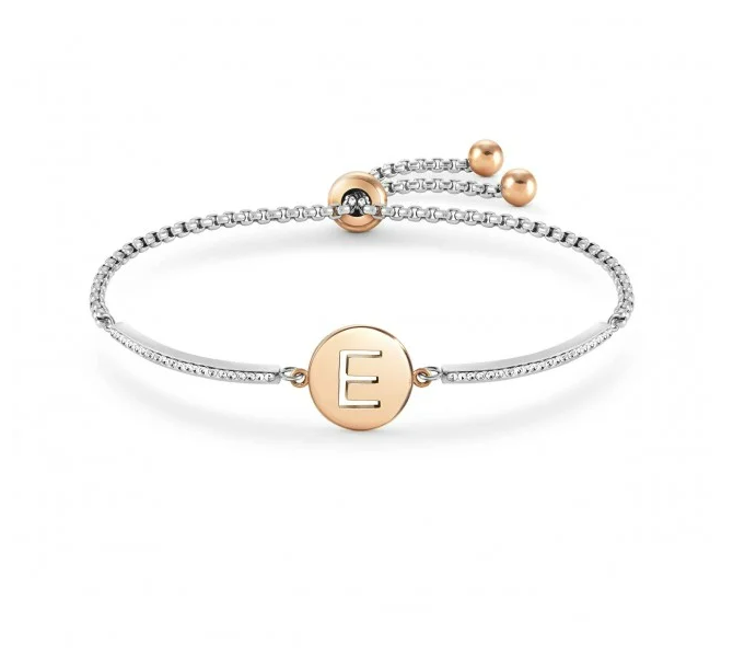 Bracciale con pendente con Lettera E in Acciaio 316/304 anallergico, dettagli in PVD rosa e pavé di Cristalli bianchi. Lunghezza 19 cm, adattabile a 14 cm. Misura del pendente 1,2 x1,2 cm.