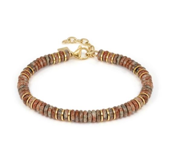 Questo bracciale esalta ogni look con una raffinata sequenza di pietre abbinate a dettagli in acciaio color oro. Le varianti cromatiche giocano con sfumature naturali di grande impatto, creando combinazioni moderne e ricercate. Un accessorio unisex, pensato per completare ogni look con un tocco distintivo.