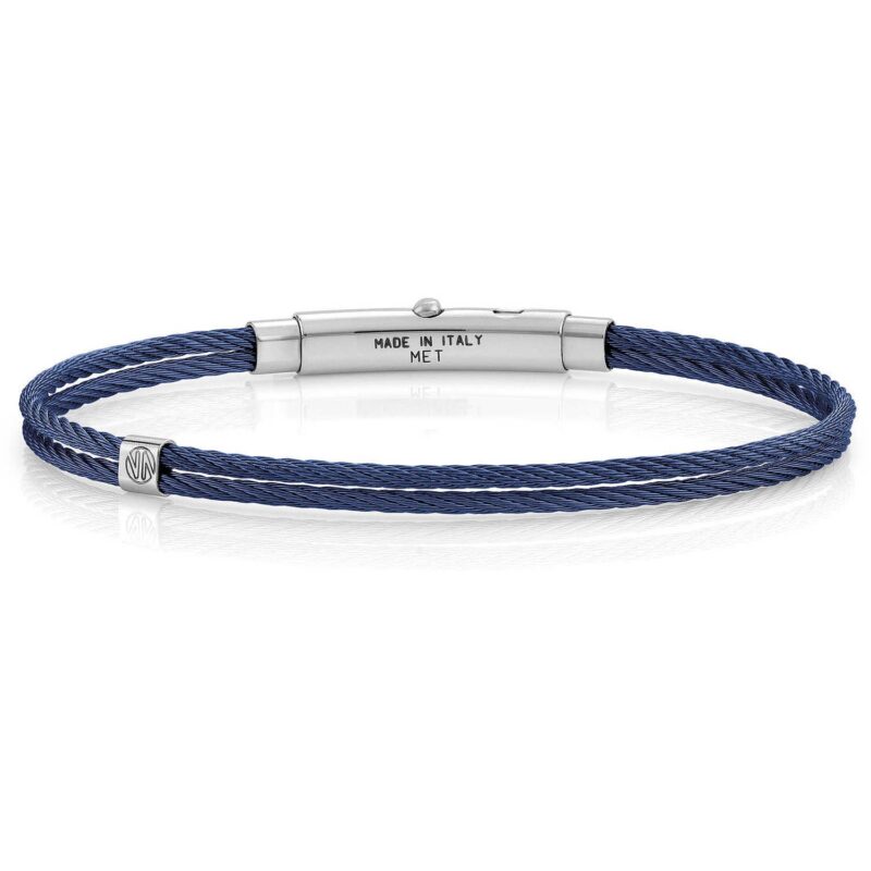 Bracciale doppio cavetto in acciaio inossidbile di colore blu; chiusura in acciaio con due possibilità di regolazione