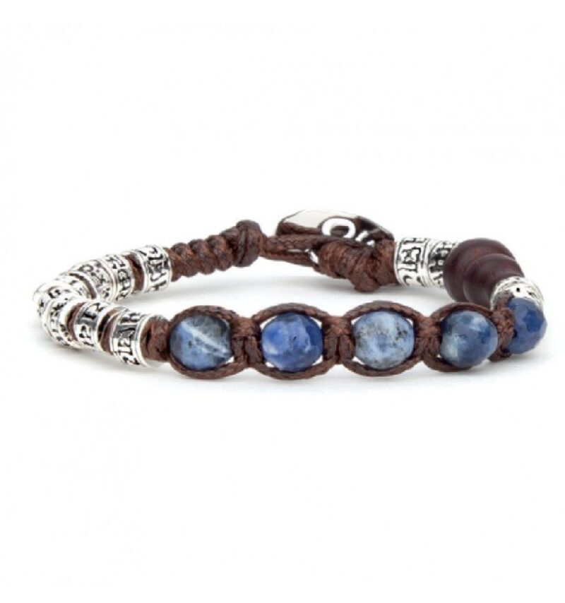 Braccialetto realizzato con cordino marrone, passanti in argento 925% con inciso il mantra “Om Mani Padme Hลซm” e sfere in sodalite sfaccettata dal diametro di 6 mm. Misura estremamente regolabile.
