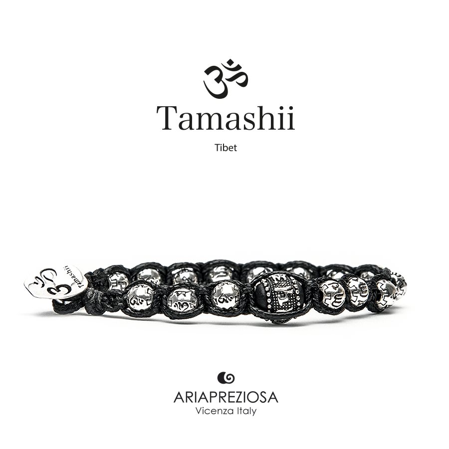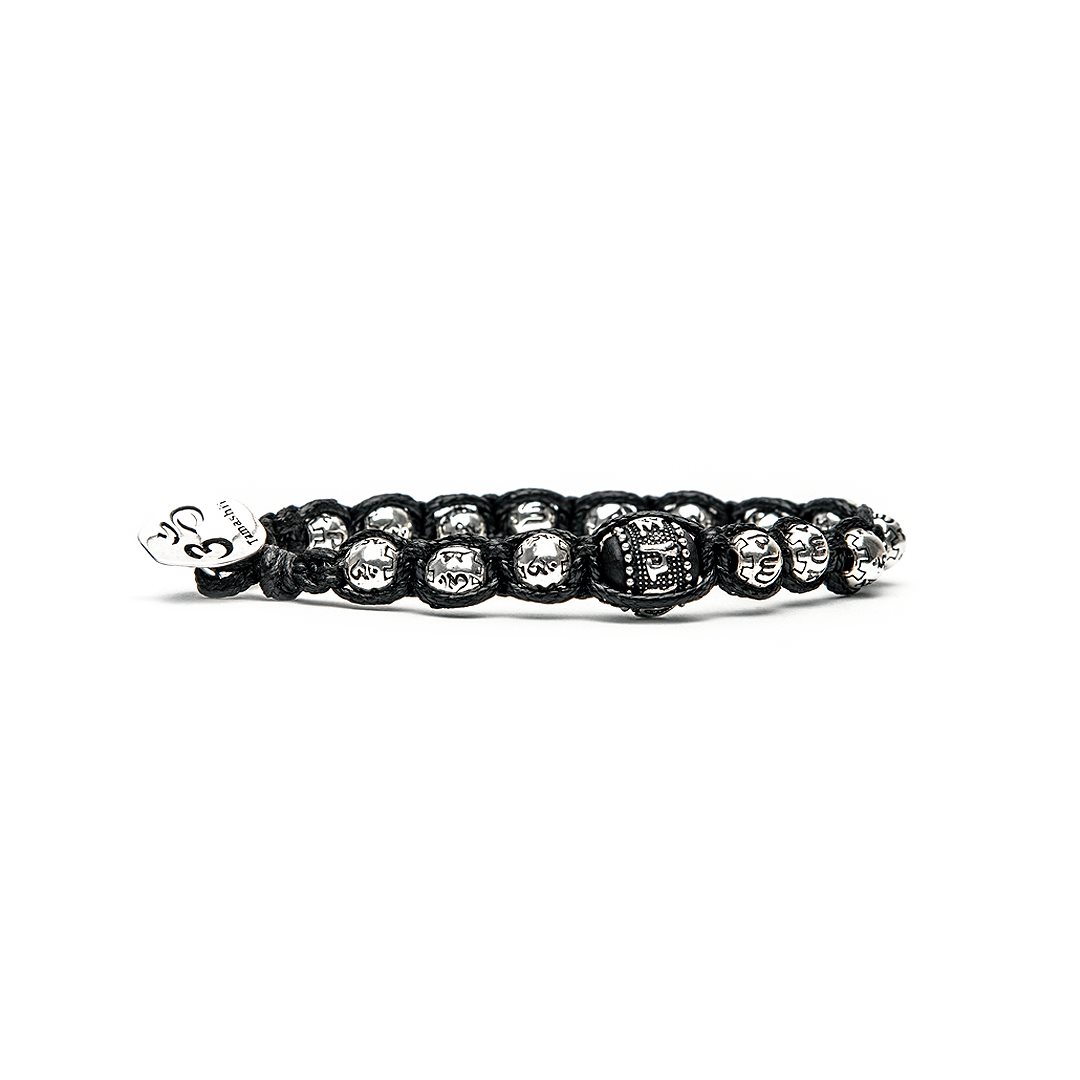 Bracciale originale in edizione limitata Tamashii ‘Ruota della preghiera’ arricchito da ruote a sfera in argento 925‰ incise con il mantra “Om Mani Padme Hūm” del Buddha della compassione Cenresig.