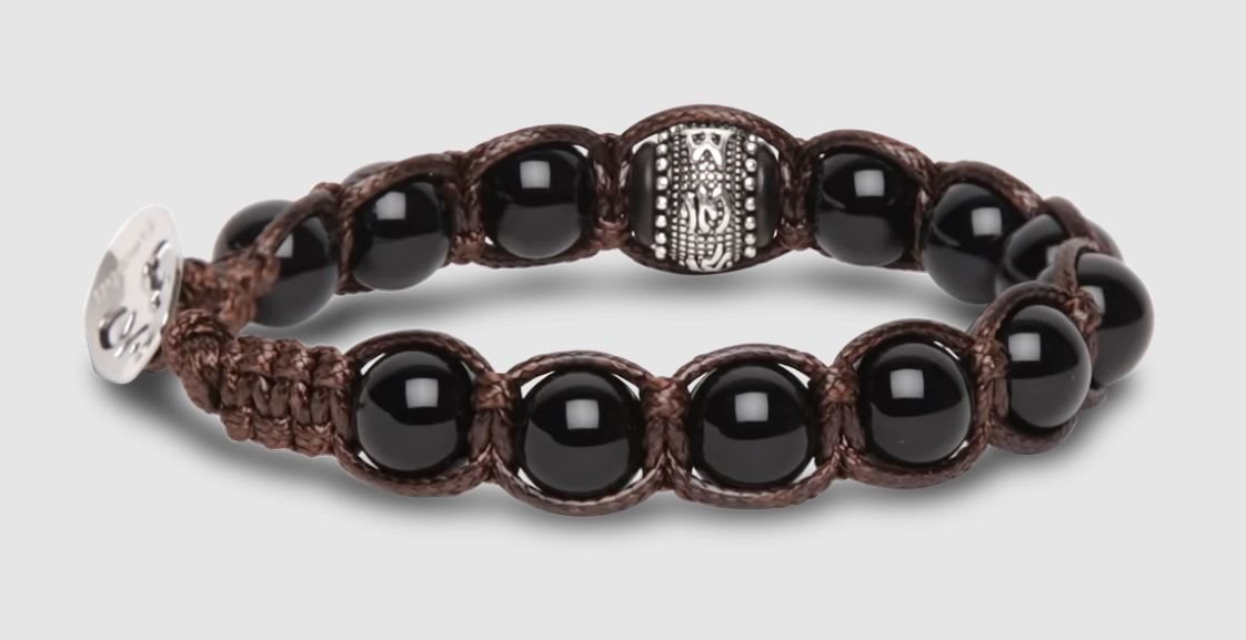 Bracciale originale tibetano Tamashiiยฎ della linea Ruota della Preghiera realizzato con pietre naturali di Onice e cordoncino marrone. Il bracciale รจ arricchito da una ruota a sfera in Argento 925 con inciso il mantra “Om Mani Padme Hลซm” del Buddha della Compassione Cenresig.