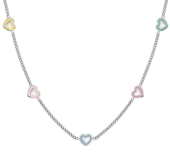 Collana in Acciaio, decorata con 5 piccoli cuori in Smalto colorato.