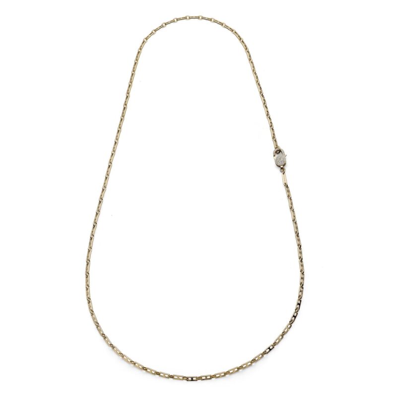 Collana lunga in catena traversino con bagno in oro e chiusura a moschettone con pavรฉ di zirconi. Misura 90,00 cm. Grazie alla sorprendente versatilitร , le catene fantasia trasformano i gioielli da semplici accessori moda a vere e proprie chiavi di stile per esprimere noi stessi e la nostra unicitร . Questa collana lunga dalla linea affusolata puรฒ anche essere indossata a doppio giro come un choker e grazie al design elegante e leggero รจ perfetta in ogni occasione.