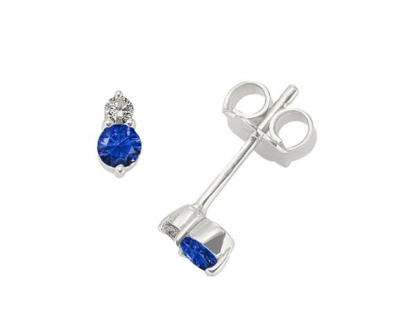 Paio di orecchini in oro bianco 18 KT con 2 zaffiri naturali a taglio rotondo e 2 diamanti bianchi qualità G Si da 0.03 ct per una caratura totale di 0.06 ct