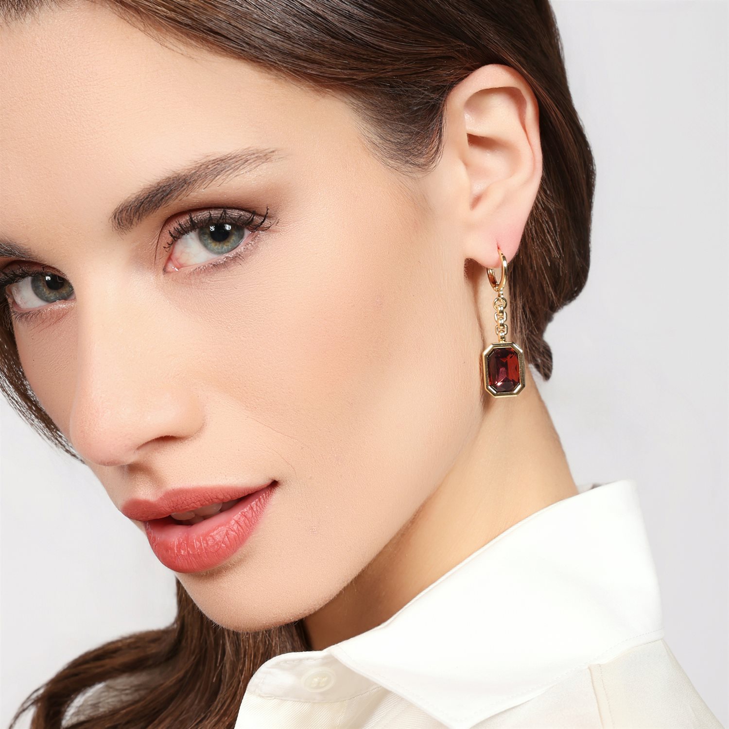 Orecchini catena veneziana placcati oro con pendente in cristallo marrone taglio smeraldo. Chiusura a monachella tonda. Lunghezza 4,00 cm. Collezione Joya.