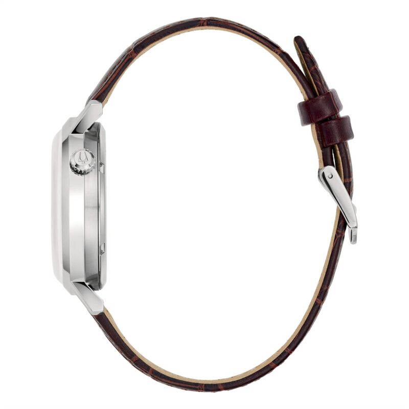 Orologio solo tempo da uomo di Bulova della collezione Aerojet. Il materiale della cassa รจ acciaio di misura 38 mm. Il materiale del cinturino รจ pelle di colore marrone. La chiusura del cinturino รจ deployante. Gli indici sono a tacche. Il movimento รจ automatico. La resistenza all’acqua รจ di 30 metri.