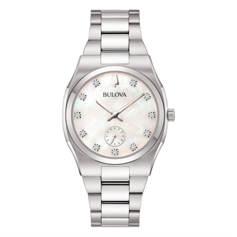 Orologio donna Solo Tempo modello Surveyor Piccoli Secondi. Cassa in acciaio lucida e satinata. Movimento al quarzo ore minuti secondi. Vetro minerale. Quadrante in madreperla con 11 diamanti incastonati e certificati, lancette lucide. Bracciale regolabile in acciaio lucido e satinato, chiusura a farfalla con pulsanti. Scatola Certificato Diamanti libretto e Garanzia 5 anni originali.