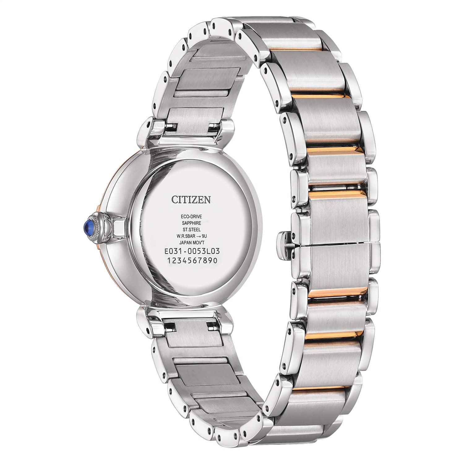 Cassa e bracciale in acciaio. Diamante sul quadrante ad ore 8. Corona decorata da cabochon. Vetro zaffiro convesso. WR 5 bar.