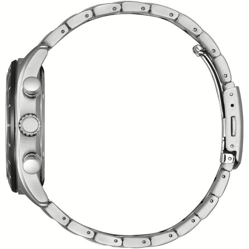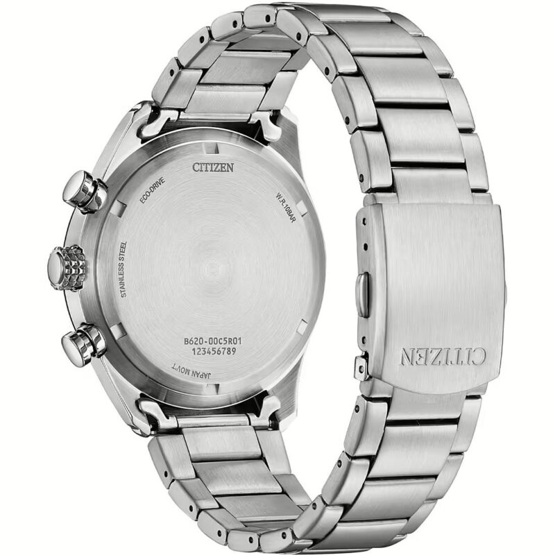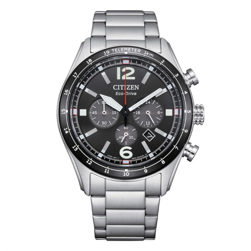 Orologio da uomo del brand Citizen della collezione Aviator Crono. Orologio cronografo con cassa in acciaio con fondo serrato a vite diametro cassa 43 mm e vetro minerale. Quadrante nero con indici applicati e ghiera nera e bracciale in acciaio con chiusura a pulsante. Movimento eco drive con riserva di carica di 7 mesi cal b620, resistenza all’acqua: 10 ATM.