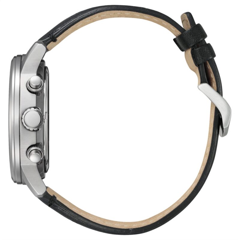Orologio cronografoย uomoย collezione CRONO RACING.ย Cassa in acciaioย lucido,diametro 44ย mm. spessore 12 mm. ,fondo a vite. Movimento quarzo, Eco Drive ( a carica luce) con riserva di carica di 270 giorni : ore minuti secondi data 24 ore.ย Cronografo a 1/5 di sec. fino a 60 minuti. Vetro minerale. Quadrante neroย ,ย indici ( 4 ) eย lancetteย luminose. Cinturino in pelle nera traforata , fibbia con ardiglioneย . Impermeabile 10 bar ( 10 atm.) . Peso 87ย grammi. Scatola e Libretto Istruzioni originali. Garanzia 2 anni.