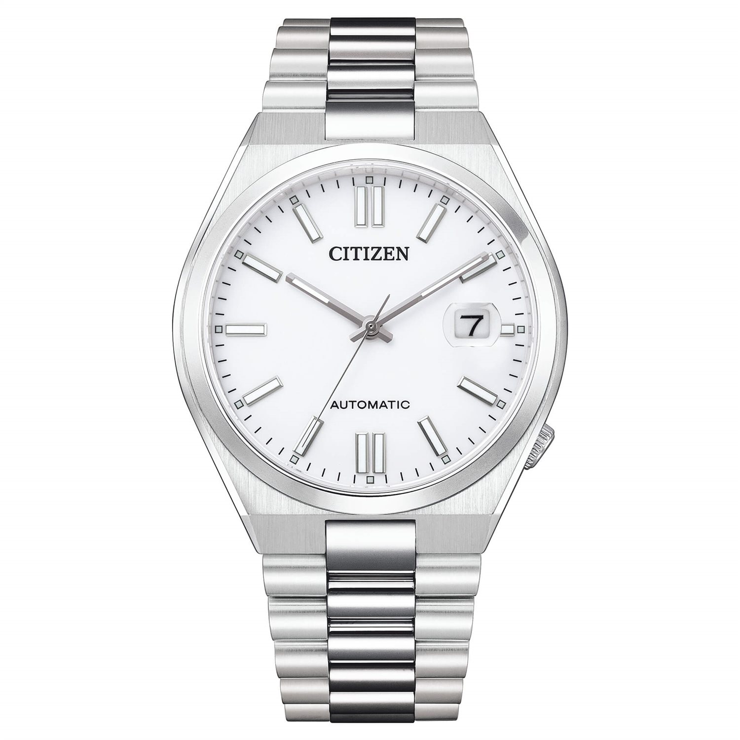 Orologio solo tempo da uomo di Citizen, della collezione TSUYOSA. Orologio con quadrante in vetro zaffiro, con cassa in acciaio con fondello a vista, diametro cassa 40 mm. Quadrante di colore bianco con indici applicati e datario con lente. Bracciale in acciaio con chiusura a pulsante e movimento meccanico automatico con riserva di carica di 40 ore