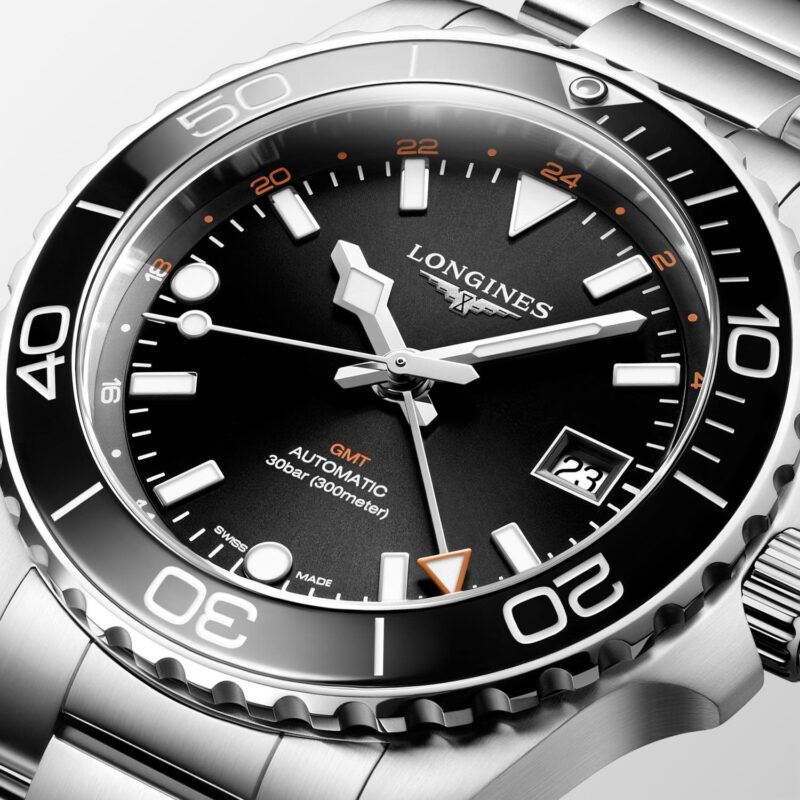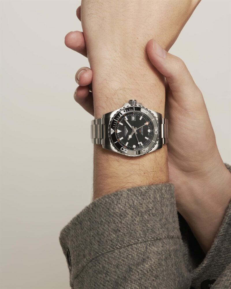 L’HydroConquest GMT si distingue anche per la cassa in acciaio inossidabile da 41 mm con fondello e corona avvitati. Questo modello presenta una nuova lunetta unidirezionale scanalata in ceramica nera con capsula luminescente. Il quadrante è nero. Questa versione è disponibile con bracciale in acciaio inossidabile o cinturino in caucciù nero.