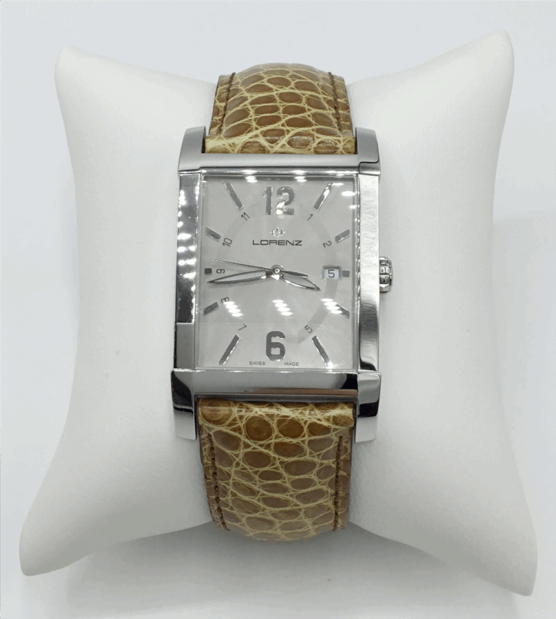 Questo orologio Lorenz ha una cassa rettangolare in acciaio inox di 29 mm x 34 mm ed è dotato di un cinturino in Pelle marrone chiaro. All’interno ha un movimento al quarzo ed è finito con un vetro zaffiro antigraffio. L’orologio è impermeabile a 3ATM. Questo significa che l’orologio resiste a piccole quantità di acqua, come lavarsi le mani.