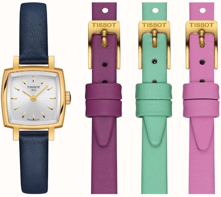 Specifiche del modello: t0581093603103 la cassa quadrata in acciaio inossidabile rivestita in pvd oro giallo dell’orologio misura 20 mm di diametro. lancette a bastone dorate e indici a bastone dorati completano il quadrante argentato. questo modello è dotato di quattro cinturini intercambiabili a sgancio rapido. i cinturini sono tutti realizzati in pelle e sono disponibili nelle opzioni di colore blu, viola, verde e rosa. l’orologio è resistente agli schizzi e non deve essere immerso in acqua. tipo di movimento quarzo