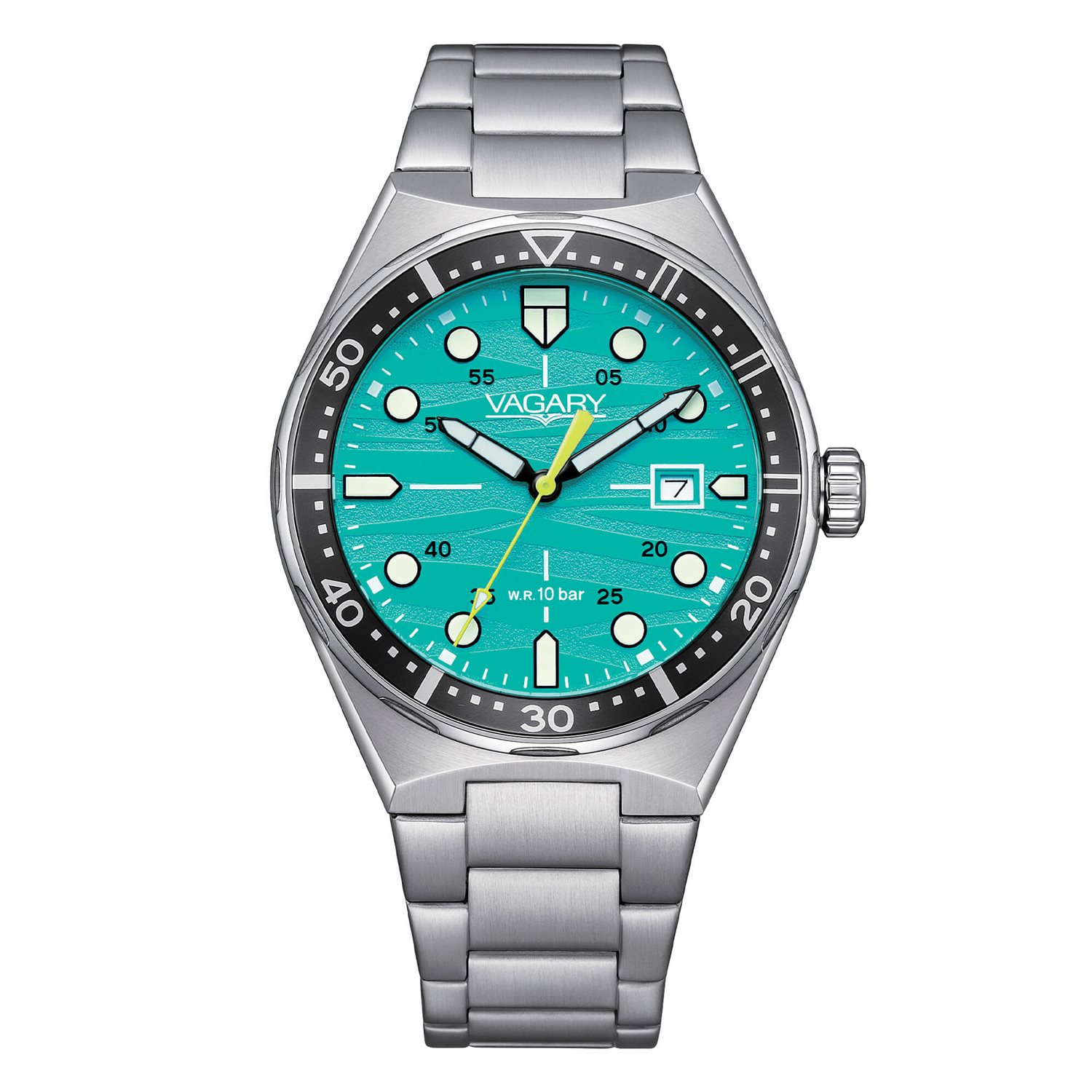 Orologio Solo Tempo da uomo di Vagary della collezione Aqua 39. Orologio con cassa in acciaio con fondo serrato a vite diametro cassa 39 mm e quadrante verde chiaro con indici applicati. . Orologio con bracciale in acciaio integrato con chiusura a pulsante. La resistenza all’acqua è di 10 atm. Movimento: movimento al quarzo citizen. . Orologio con datario. La referenza è IB9 514 73