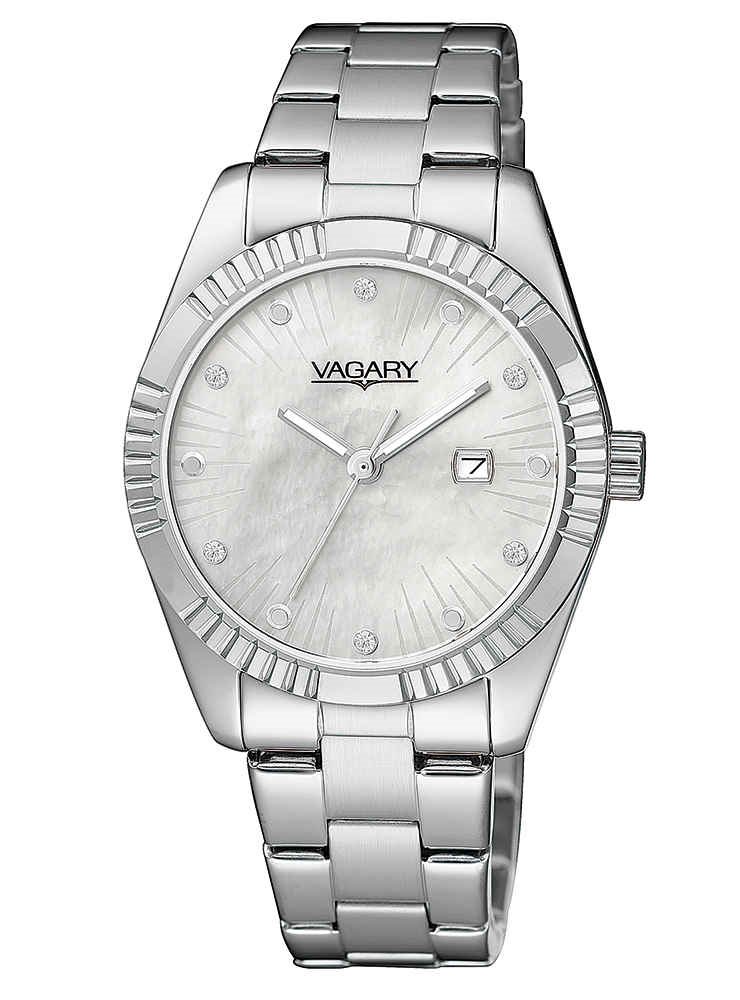 Cassa e bracciale in acciaio. Quadrante in madreperla. WR 5 bar.