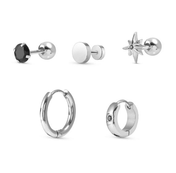 Set di 5 orecchini Atlante Stones Edition in Acciaio anallergico 316/304 di diverse forme e misure con Cubic Zirconia neri. Per chi ama cambiare accessori frequentemente questo è il kit giusto: un mix di orecchini che dà la possibilità di cambiare il proprio look per ogni occasione.