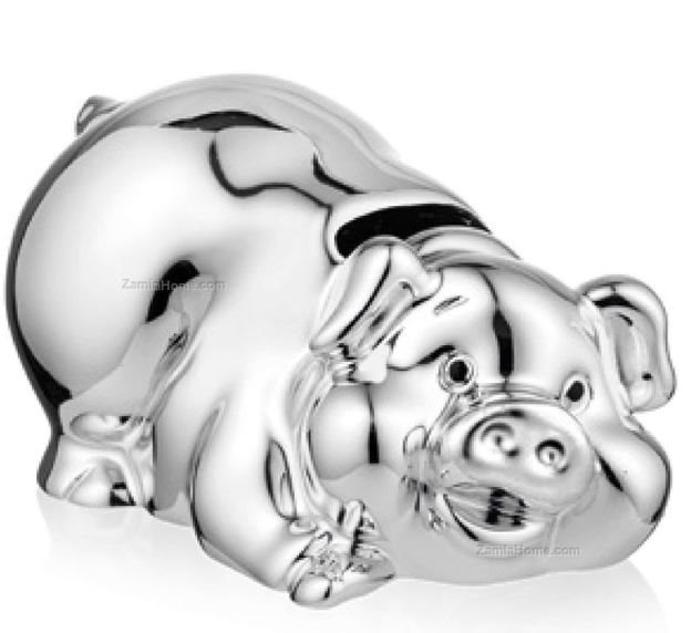 Maialino salvadanaio in resina argentata.